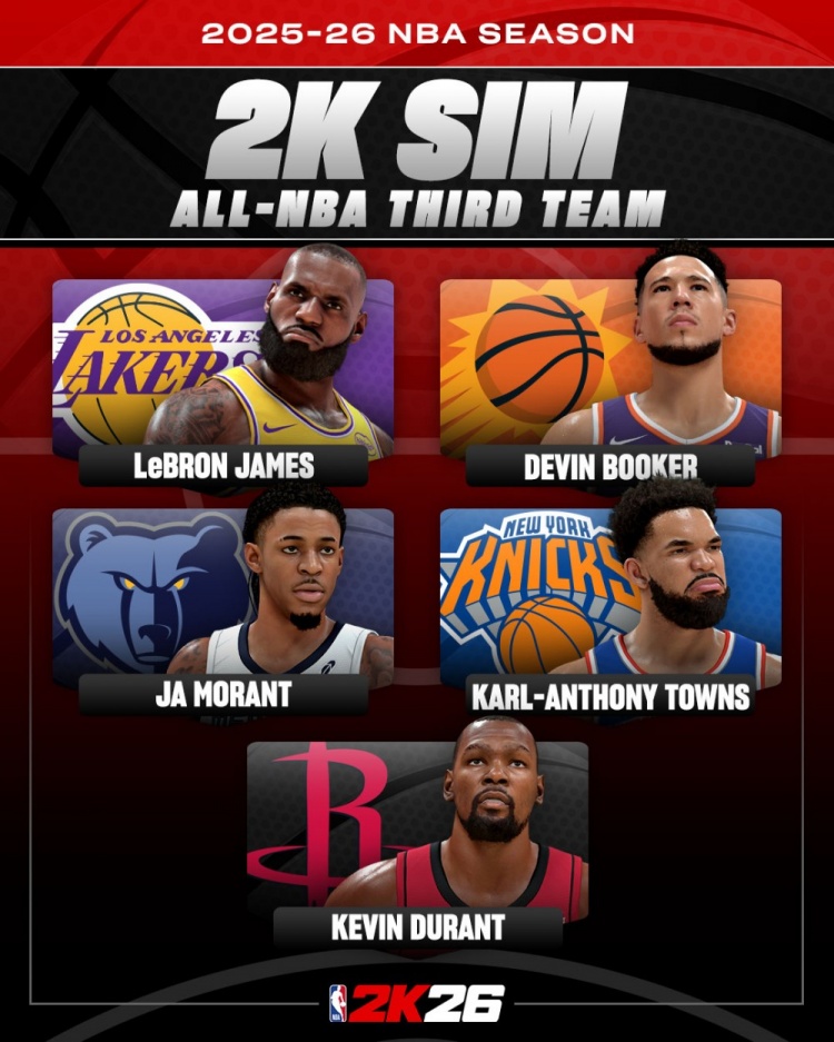 NBA 2K26 official social media updated the news, showing their simulated predictions of the players in the first, second and third teams of the new season's best team, and the text read: "NBA The best lineup for the 2025-26 season predicted by 2K simulation is released. Do you agree with this "game version" selection? "