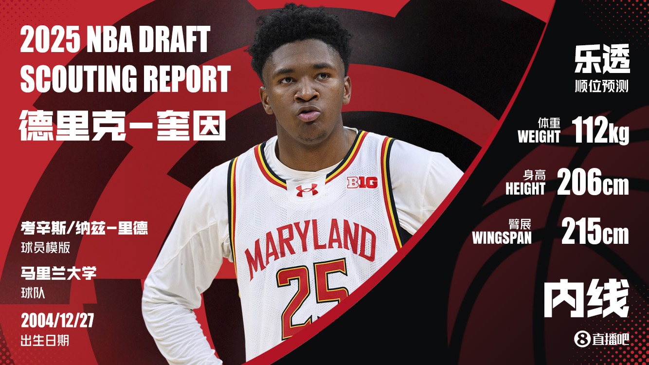 Derek Quinn is 2.06 in height (naked feet), weighing 112 kg, and having a wingspan of 2.15. In the 2024-25 season (freshman), Quinn played 36 games, averaging 30.4 minutes per game, scoring 16.5 points, 9 rebounds, 1.9 assists, 1.1 blocks and 1.1 steals, shooting percentage of 52.6%, three-point shooting percentage of 20%, and free throw percentage of 76.6%.