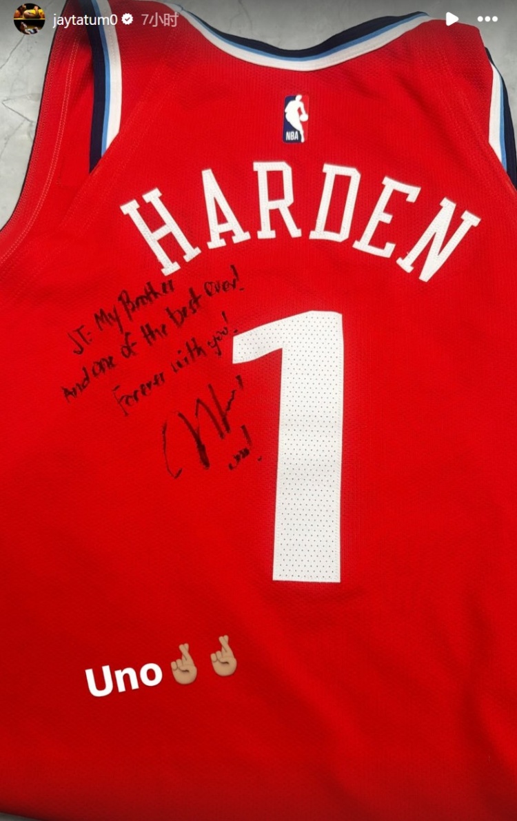 Today, Celtics star Tatum posted a jersey signed by Harden for himself, which read: "To my brother, one of the best players in the world, I wish you all the best."