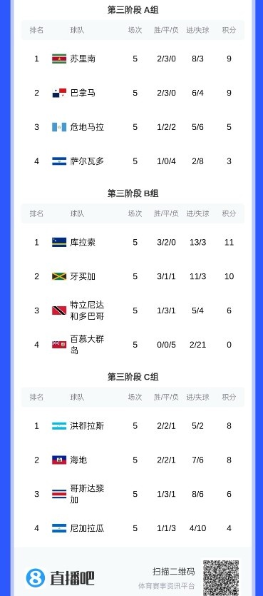 According to the rules, in the third stage of the CONCACAF qualifiers, 12 teams are divided into 3 groups, with 4 teams in each group participating in a double round-robin competition. The top team in each group directly advances to the World Cup, and the two best second-placed teams receive play-off spots.