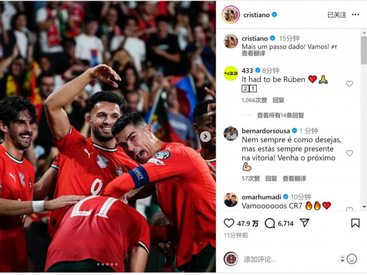 Beat Ireland! Cristiano Ronaldo posted photos on social media to celebrate his victory: Another step forward, come on!
