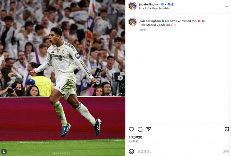 Real Madrid faced Juventus at home in this round of the Champions League focus match, and finally won 1-0 with Bellingham's goal. Bellingham also posted a commemorative photo on social media after the game.