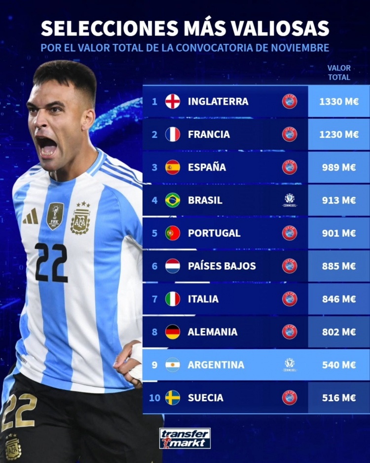 The German transfer market has calculated the value of each national team on the November international match day and listed the list. England, France, and Spain are the top three, and Argentina ranks ninth.