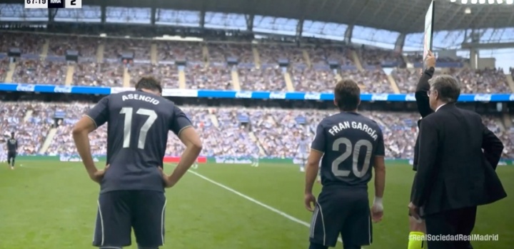 game, Real Madrid, with 10 players fighting, made a substitution adjustment, Vinicius and Sebalos were replaced, and Fran Garcia and Asensio came on as substitutes. Real Madrid 2-1 Real Sociedad scored on the field.