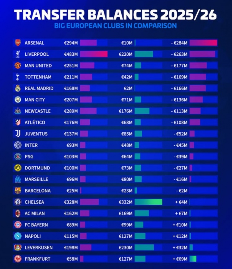 Germany s 20 European teams transfer profit and loss this summer: Arsenal s net expenditure was 284 million, and France Eagles made a profit of 69 million