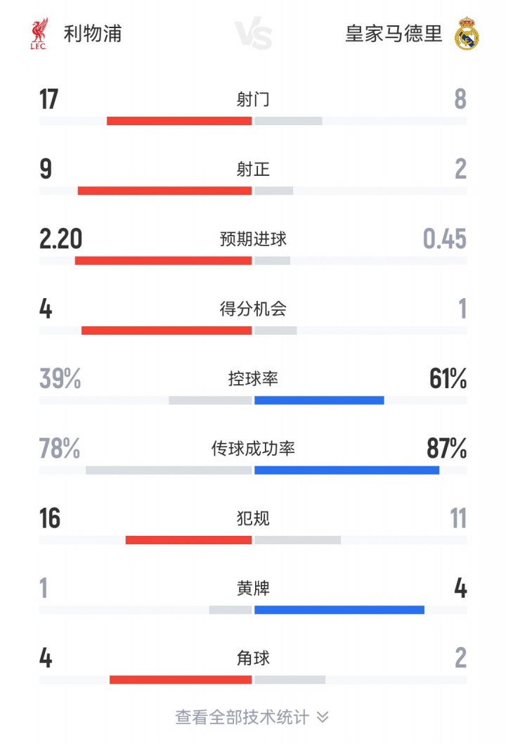 In the fourth round of the Champions League, Liverpool defeated Real Madrid 1-0 at home. The full field data is as follows:
