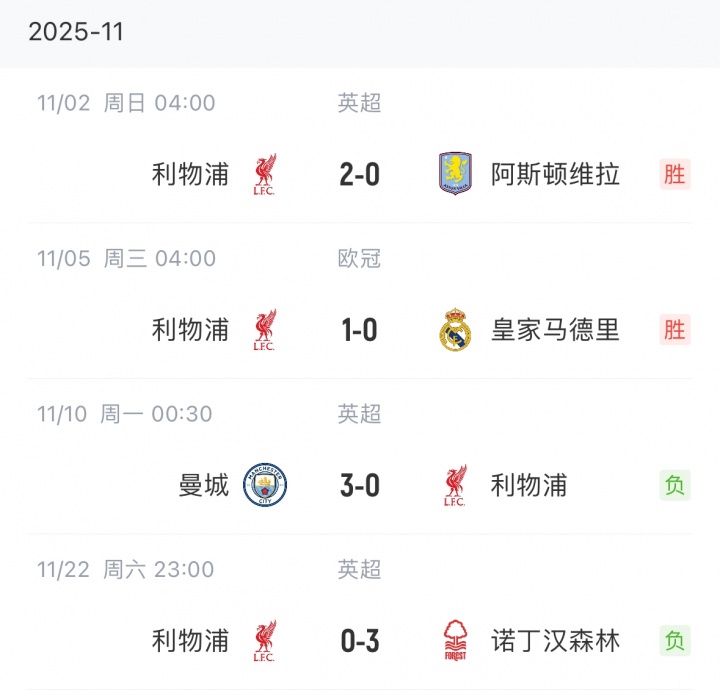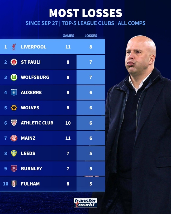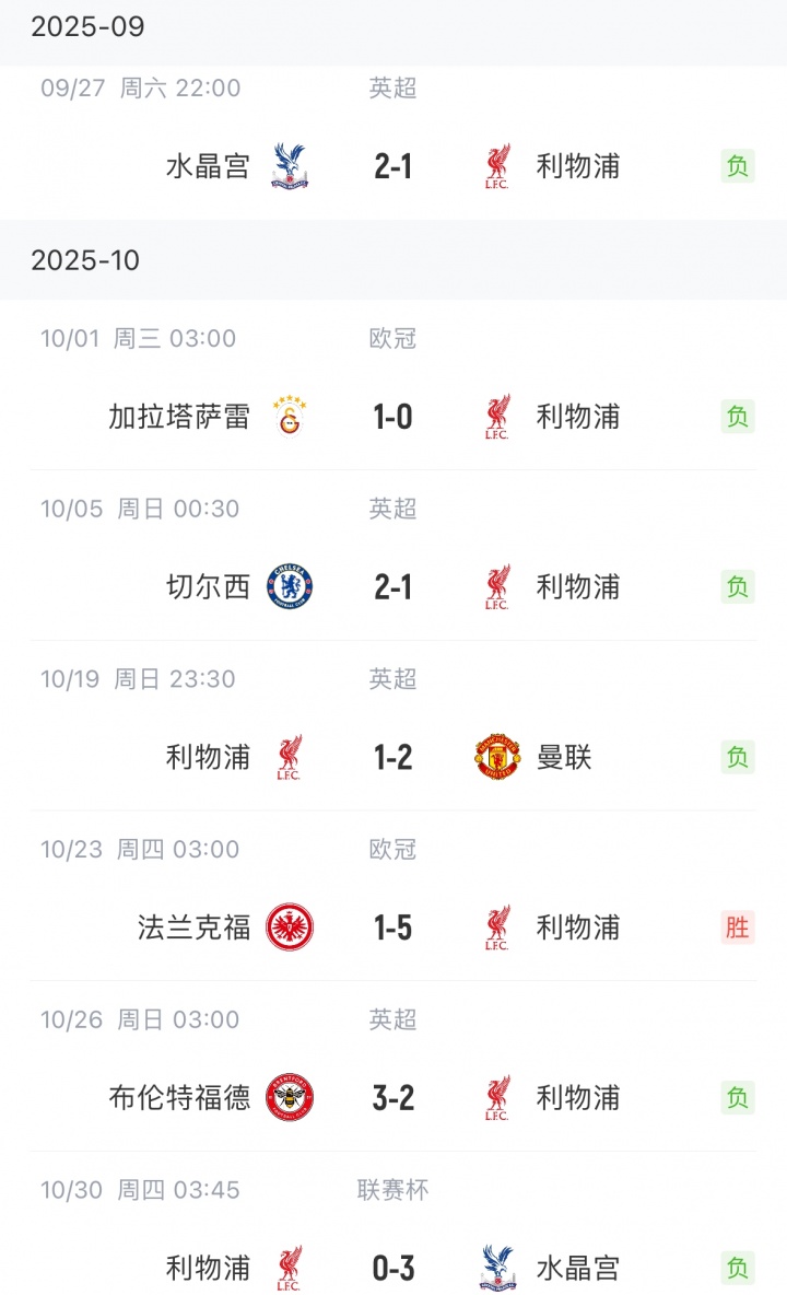 Lost 8 games! Liverpool has lost the most games in the five major leagues since September 27