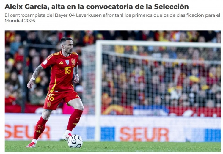 The Spanish national team issued an official announcement, announcing the recruitment of Leverkusen's 28-year-old midfielder Alex Garcia into the World Cup qualifiers.