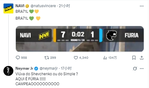 After the game, Neymar, a well-known fan of the Panthers, couldn't help but repost NAVI's news on social media, and replied: