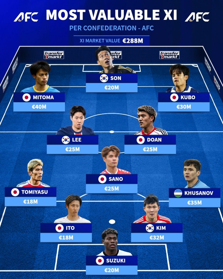 Forwards: Son Heung-min (20 million euros), Mikasa Kaoru (40 million euros), Kubo Takehide (30 million euros)