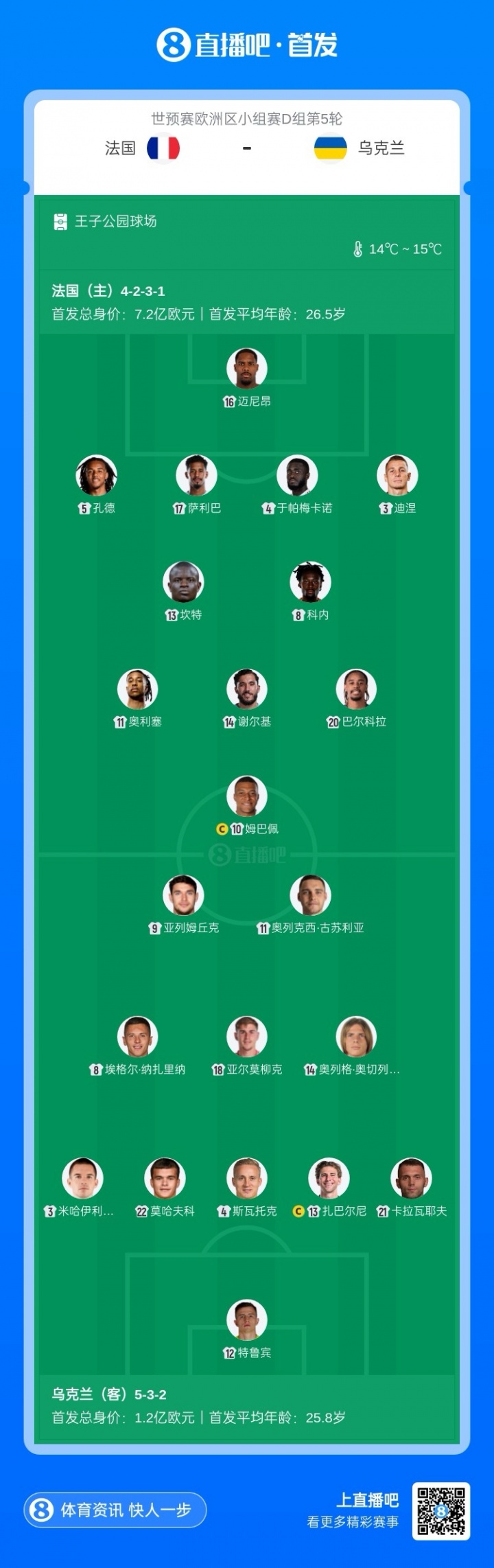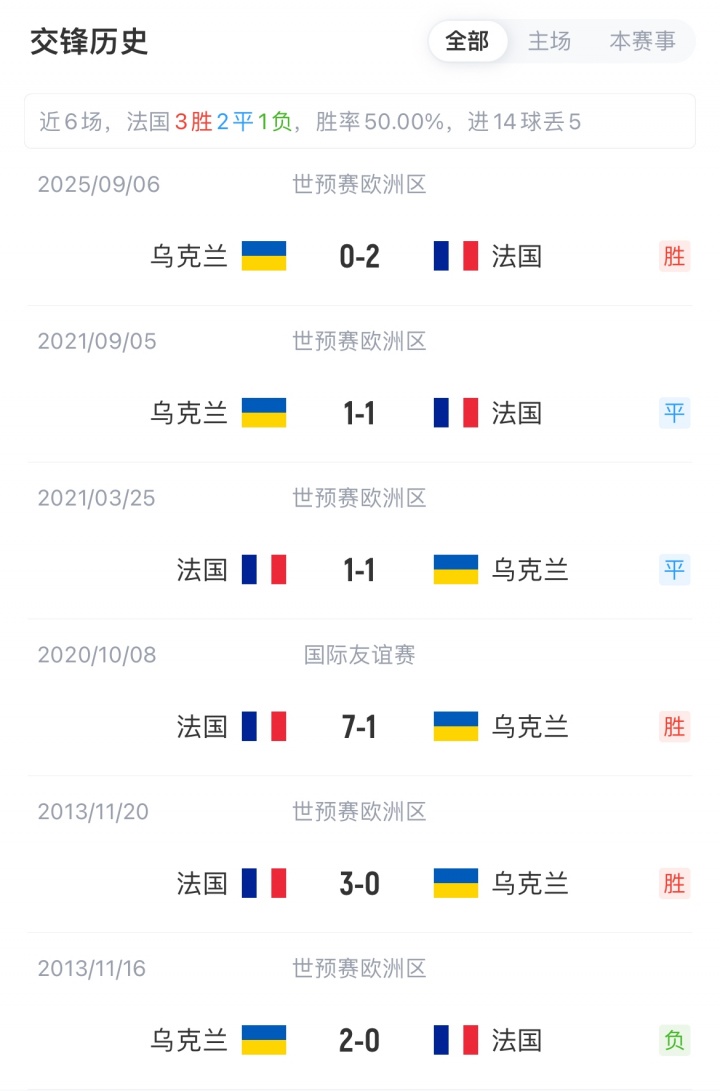 France has 3 wins, 1 draw and 10 points, temporarily ranking first in Group D; Ukraine has 2 wins, 1 draw, 1 loss and 7 points, temporarily ranking second, and has been unbeaten in the past 3 rounds. If France defeats Ukraine in this game, it will advance to the World Cup one round early. France has been unbeaten in 4 consecutive games against Ukraine in the main match (2 wins and 2 draws).