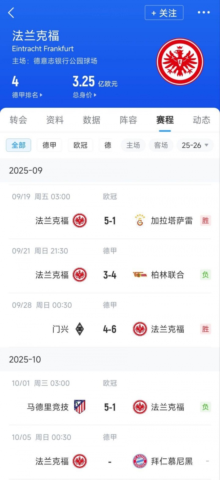 Frankfurt's record in the last 4 games: 5-1 Galatasaray, 3-4 Berlin United, 6-4 Borussia Dortmund, 1-5 Atletico Madrid, at least 6 goals in each game, either you die or I die. In the next game, Frankfurt will face Bayern at home.